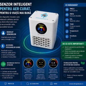 - Monitorizare real-time a poluanților: PM2.5, CO₂, VOC-uri, temperatură & umiditate
