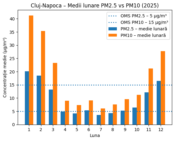 Figura 1. Medii lunare PM2.5 și PM10 raportate la pragurile OMS