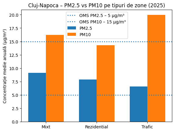 Figura 3. PM2.5 vs PM10 pe tipuri de zone – Cluj-Napoca (2025)