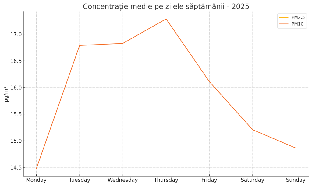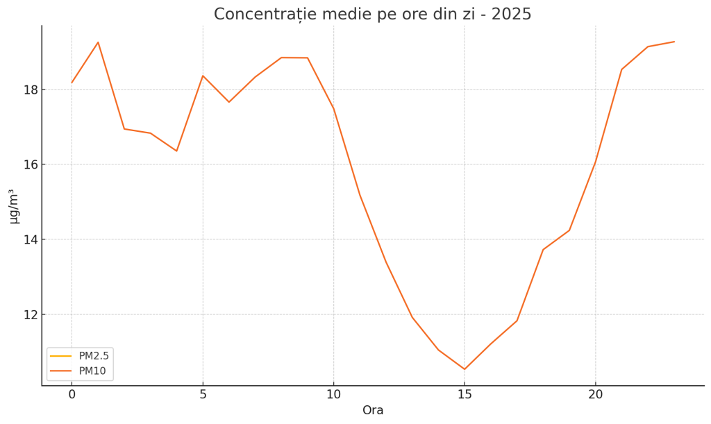 Poluarea nu afectează populația în mod constant pe parcursul zilei. Datele arată intervale orare recurente în care concentrațiile de particule cresc semnificativ, corelate cu activitățile urbane și traficul.