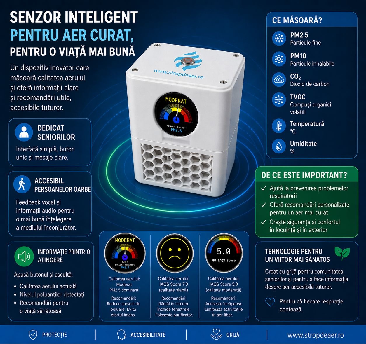 Nu este doar un dispozitiv de monitorizare – este un asistent vocal pentru sănătate, care transformă datele complexe despre calitatea aerului în informații clare, ușor de înțeles și acționabile imediat.