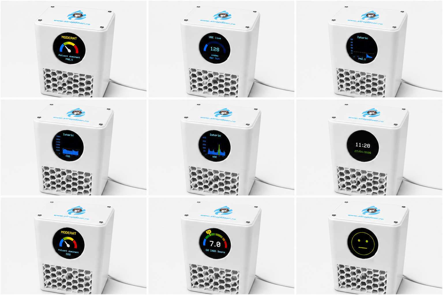 Bazat pe tehnologie avansată de senzori multi-parametru (ex. platforme similare Sensirion SEN6x), dispozitivul monitorizează în timp real: