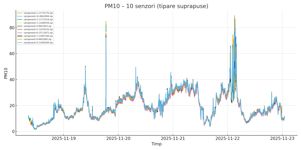 2. Evoluția PM10 – Toți senzorii suprapuși