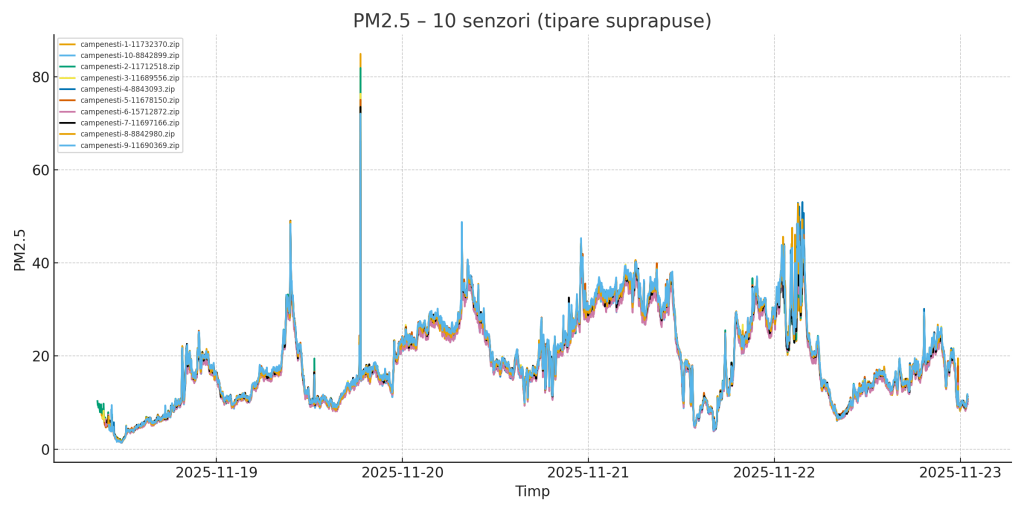 1. Evoluția PM2.5 – Toți 10 senzorii suprapuși
